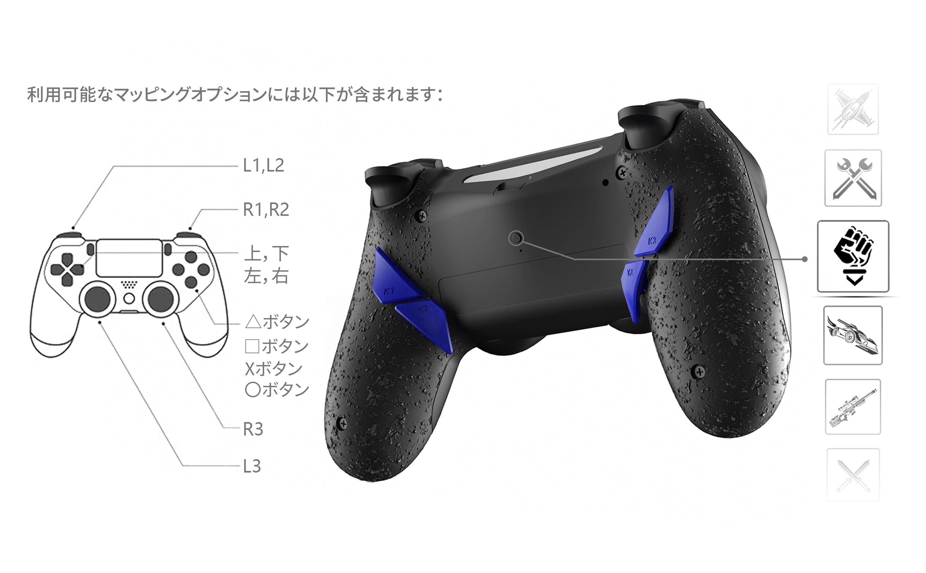 ゲーム中に最大14個のボタン(×、○、△、□、上、下、左、右、L1、L2、R1、R2、L3、R3)を背面ボタンに割り当てることができます。