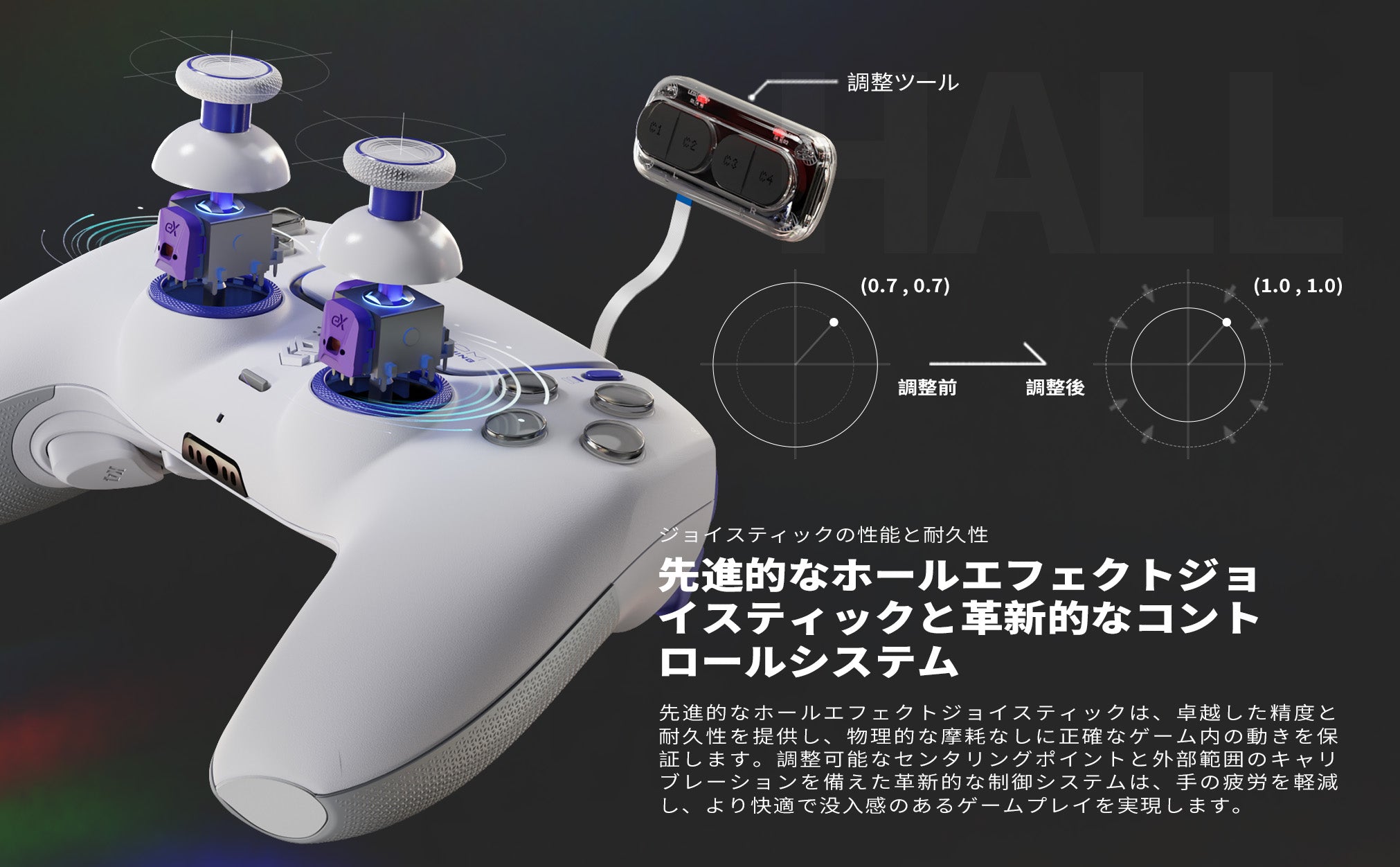 - 2種類のジョイスティックオプション: オフセット・スティック・ドリフト - 独自のDrifixテクノロジーにより、サムスティックをピンポイントの精度に保ちます。調整可能なジョイスティックモジュールにより、軸のずれを0.12の範囲で調整でき、コントローラの性能を最大限に維持できます。卓越したジョイスティック性能と耐久性 - 高度なホール効果ジョイスティックは、卓越した精度、長持ちする耐久性、信頼性の向上を実現し、ゲーム中の正確な動作と、物理的な消耗を伴わないコントロールの向上を可能にします。革新的なコントロールシステムによる、調整可能なセンタリングポイントおよび外側範囲のキャリブレーションは、長時間のゲームセッションにおける手の疲労を軽減し、より快適で没入感のあるゲームプレイを実現します。