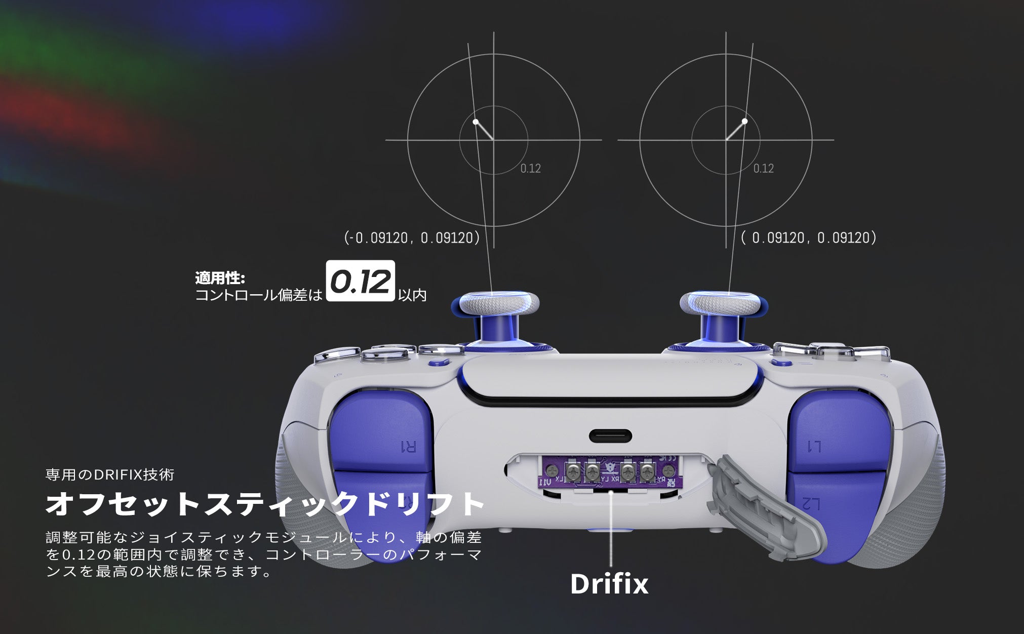 オフセットスティックのドリフト - 独自のDrifixテクノロジーにより、サムスティックをピンポイントの精度に保ちます。調整可能なジョイスティック・モジュールは、0.12の範囲で軸のずれを調整でき、コントローラーの性能を最大限に引き出します。