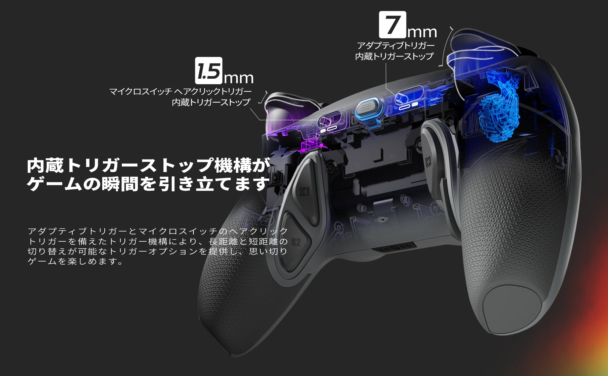 便利なトリガーモードスイッチで、アダプティブトリガーとデジタルトリガーを瞬時に切り替えられます。1.5–2mmショートトリップデジタルトリガーは、お気に入りのFPSゲームに最適で、マウスをクリックするようなトリガーアクションが得られます。一方、アダプティブトリガーは正確なコントロールが可能で、レーシングゲームでのスロットル操作に最適です。