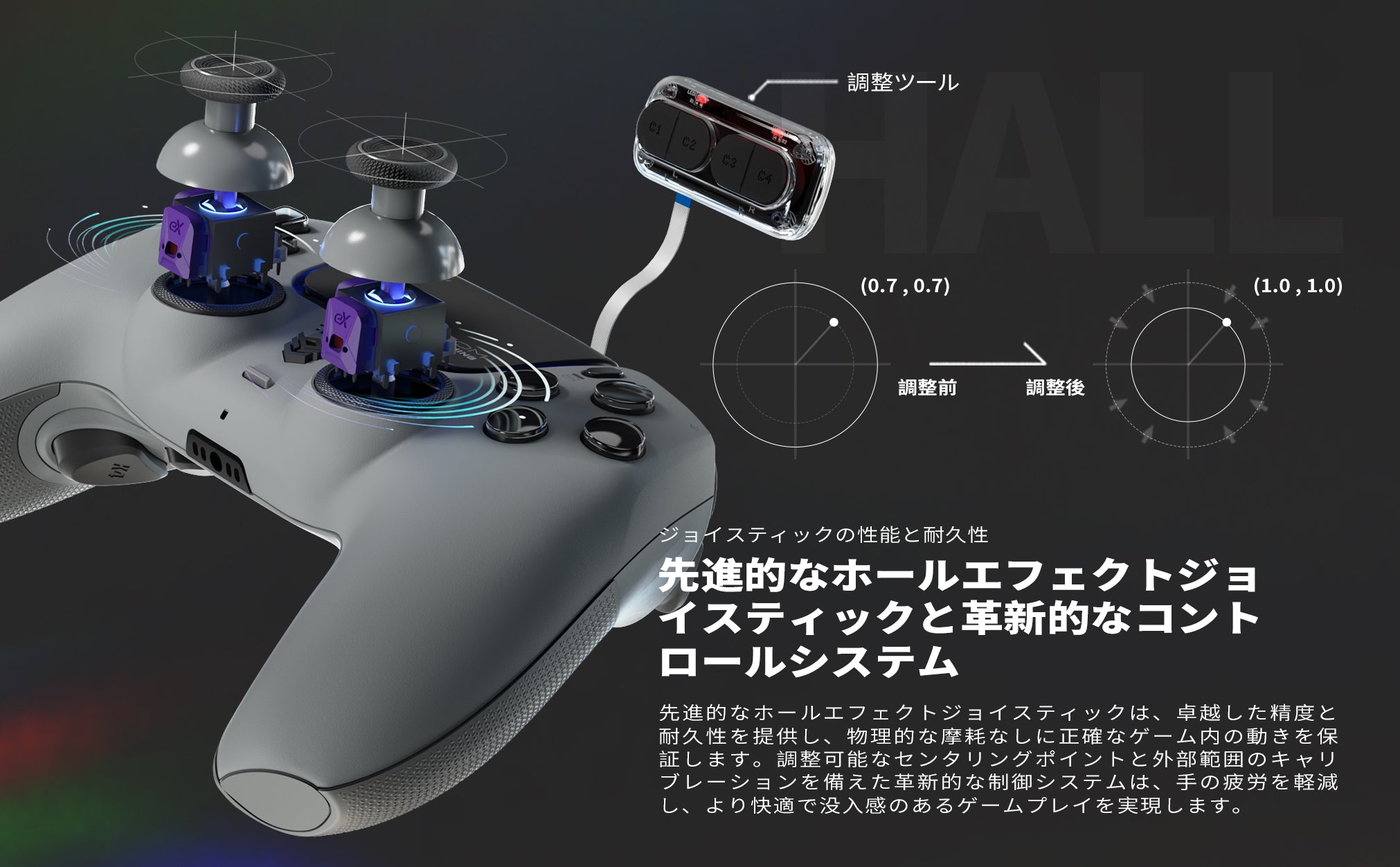 - 2種類のジョイスティックオプション: オフセット・スティック・ドリフト - 独自のDrifixテクノロジーにより、サムスティックをピンポイントの精度に保ちます。調整可能なジョイスティックモジュールにより、軸のずれを0.12の範囲で調整でき、コントローラの性能を最大限に維持できます。卓越したジョイスティック性能と耐久性 - 高度なホール効果ジョイスティックは、卓越した精度、長持ちする耐久性、信頼性の向上を実現し、ゲーム中の正確な動作と、物理的な消耗を伴わないコントロールの向上を可能にします。革新的なコントロールシステムによる、調整可能なセンタリングポイントおよび外側範囲のキャリブレーションは、長時間のゲームセッションにおける手の疲労を軽減し、より快適で没入感のあるゲームプレイを実現します。