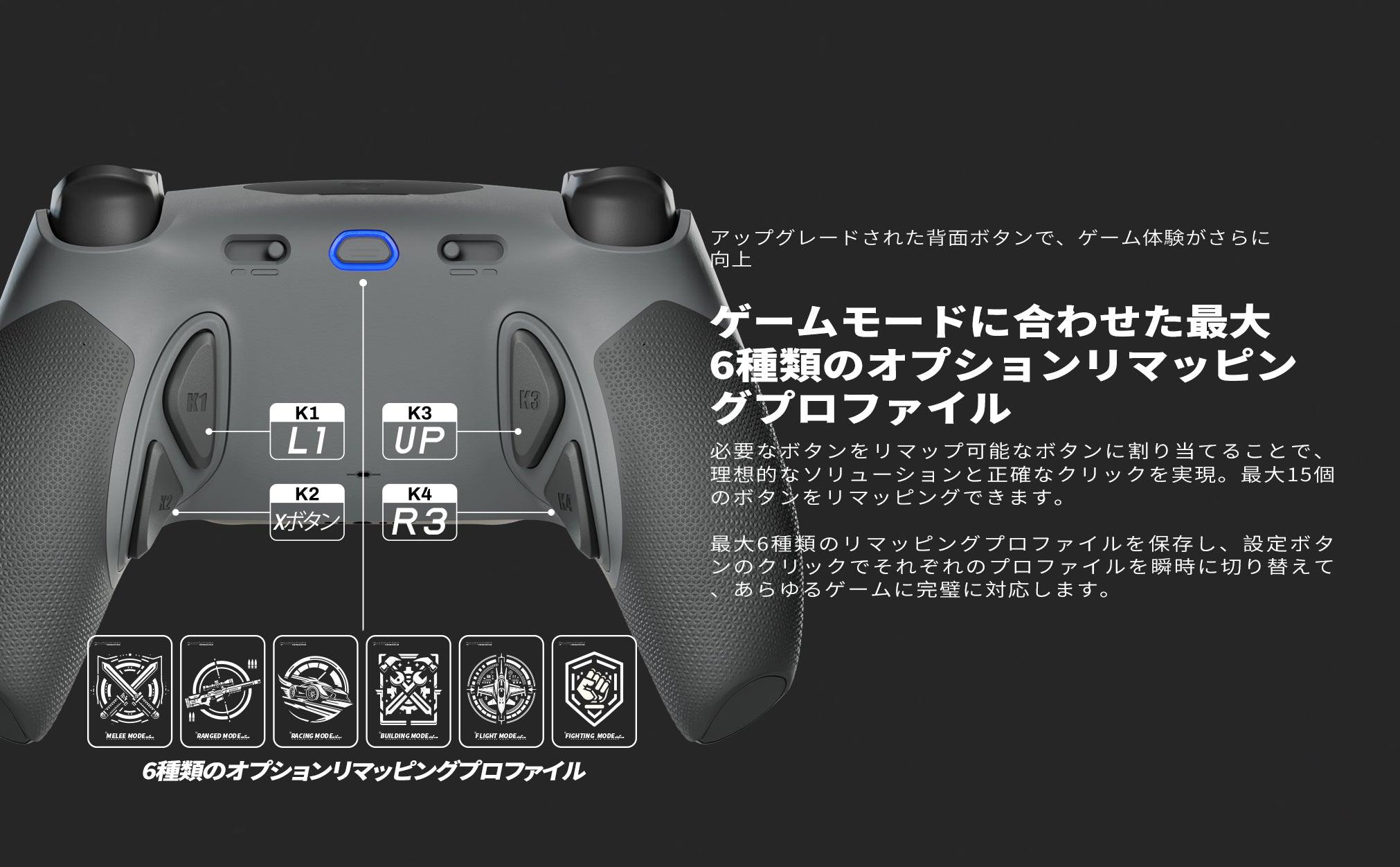 - レイアウトをカスタマイズ: 完全にリマップ可能な改造背面ボタンと6つのスワップ可能なプロファイルにより、コントロールを正確に調整し、レイアウトをシームレスに切り替えることができます。コントローラ下面の人間工学に基づいたポイントに配置された4つの触感の良い改造背面ボタンは、優れたハンズオンフィーリングと正確でクリック感のあるボタン押下を提供し、6つのスワップ可能なプロファイルは、あらゆるゲームやプレイスタイルに合わせてレイアウトを瞬時に切り替えることができます。