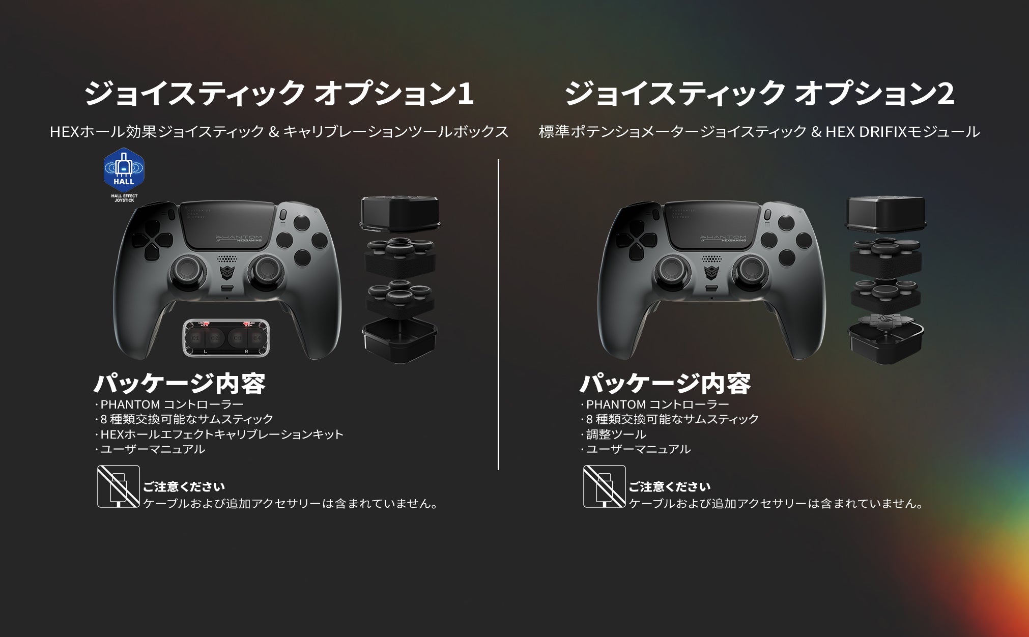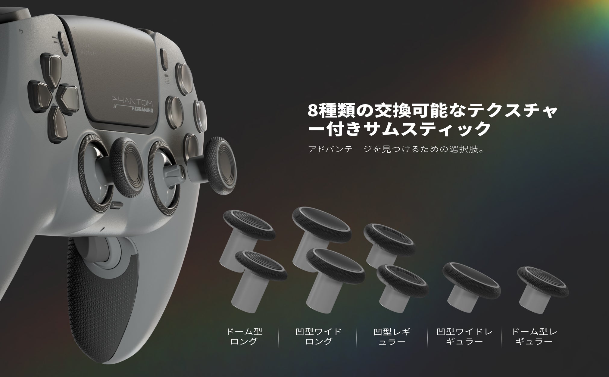 - パッケージ内容: PS5/PC用PHANTOM eSportsコントローラー、交換可能サムスティック8本、調整ツール、ユーザーマニュアル。