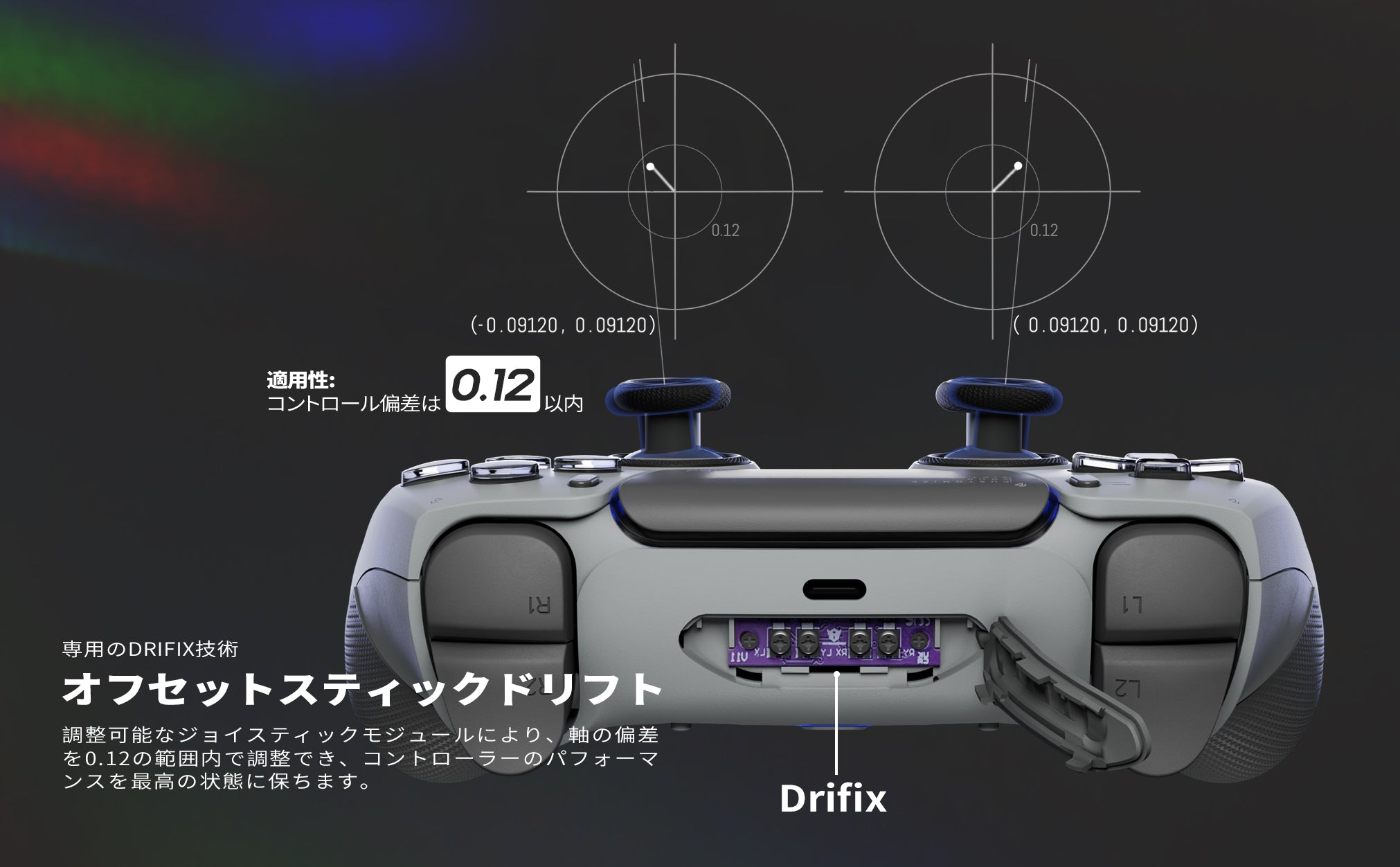 オフセットスティックのドリフト - 独自のDrifixテクノロジーにより、サムスティックをピンポイントの精度に保ちます。調整可能なジョイスティック・モジュールは、0.12の範囲で軸のずれを調整でき、コントローラーの性能を最大限に引き出します。