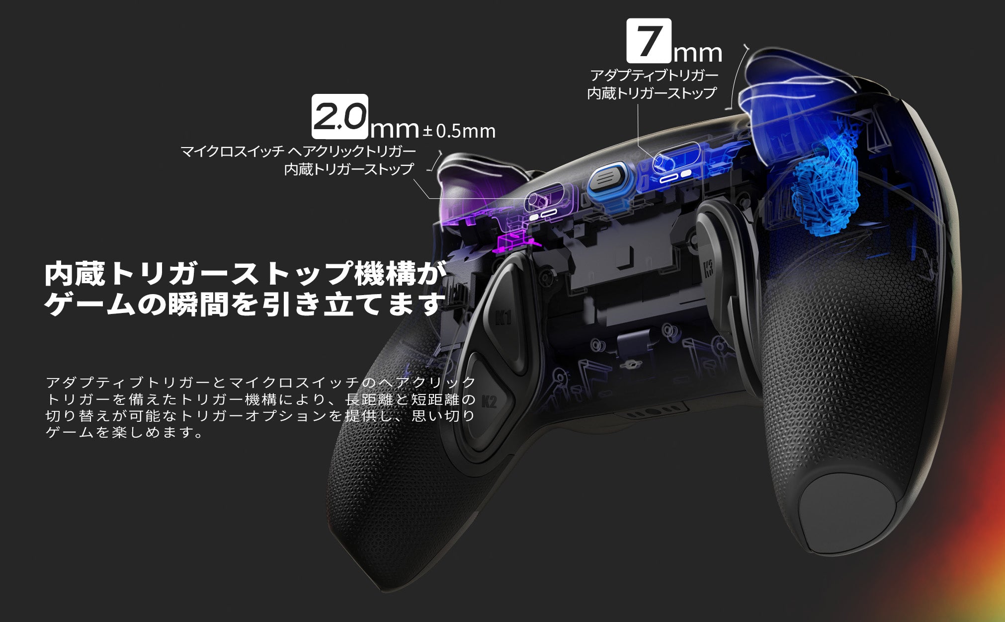 レイアウトのカスタマイズ - フルリマップ可能な改造背面ボタンと6つのスワップ可能なプロファイルにより、コントロールを正確に調整し、レイアウトをシームレスに切り替えることができます。コントローラ下面の人間工学に基づいたポイントに配置された4つの触感の良い改造背面ボタンは、優れたハンズオンフィーリングと正確でクリック感のあるボタン押下を提供し、6つのスワップ可能なプロファイルは、あらゆるゲームやプレイスタイルに合わせてレイアウトをその場で切り替えることができます。