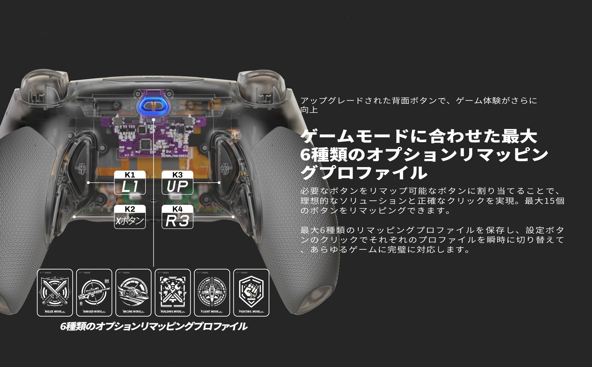 - レイアウトをカスタマイズ: 完全にリマップ可能な改造背面ボタンと6つのスワップ可能なプロファイルにより、コントロールを正確に調整し、レイアウトをシームレスに切り替えることができます。コントローラ下面の人間工学に基づいたポイントに配置された4つの触感の良い改造背面ボタンは、優れたハンズオンフィーリングと正確でクリック感のあるボタン押下を提供し、6つのスワップ可能なプロファイルは、あらゆるゲームやプレイスタイルに合わせてレイアウトを瞬時に切り替えることができます。