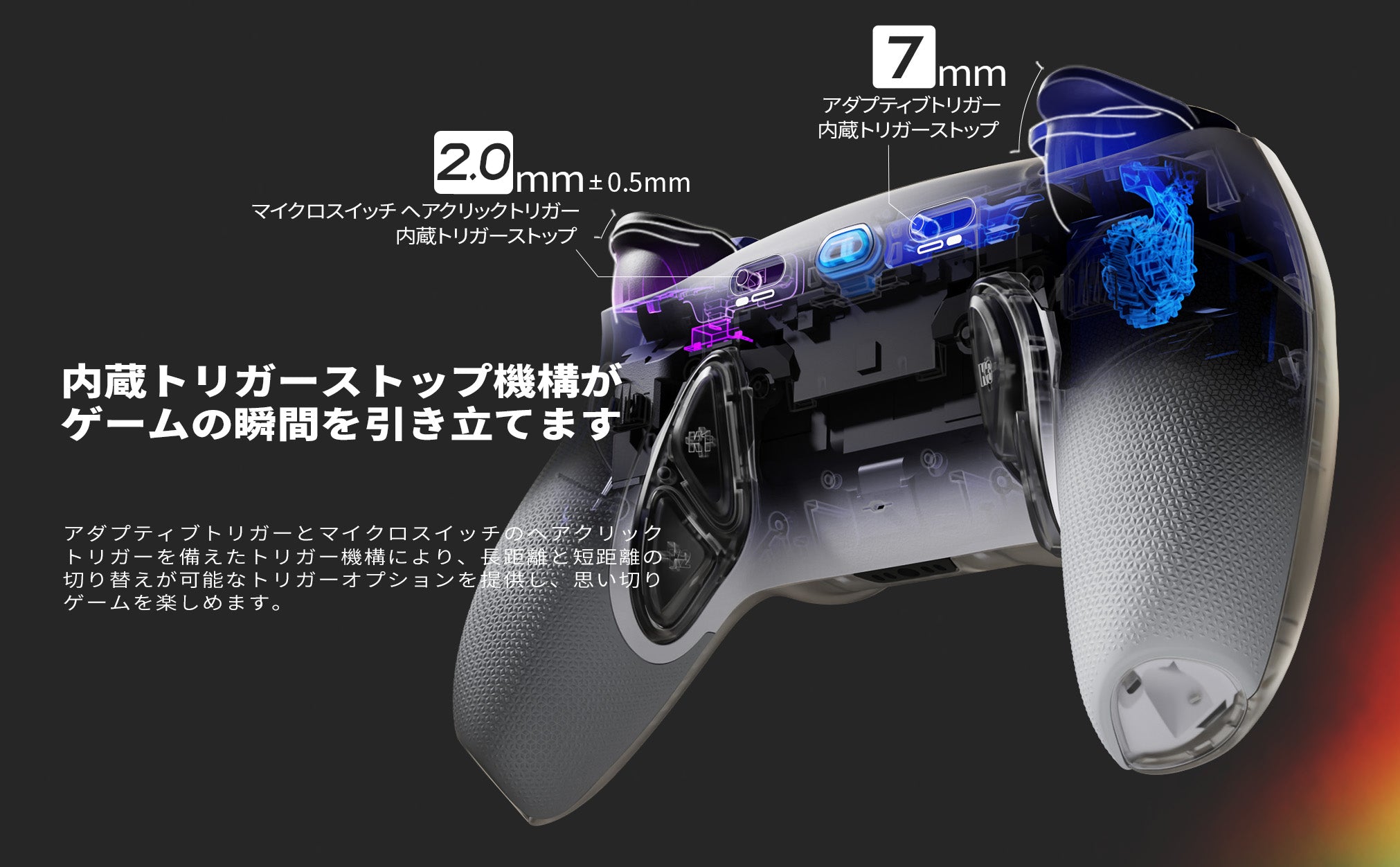 トリガーストップ機構を内蔵し、ゲーミングモーメントを際立たせます。