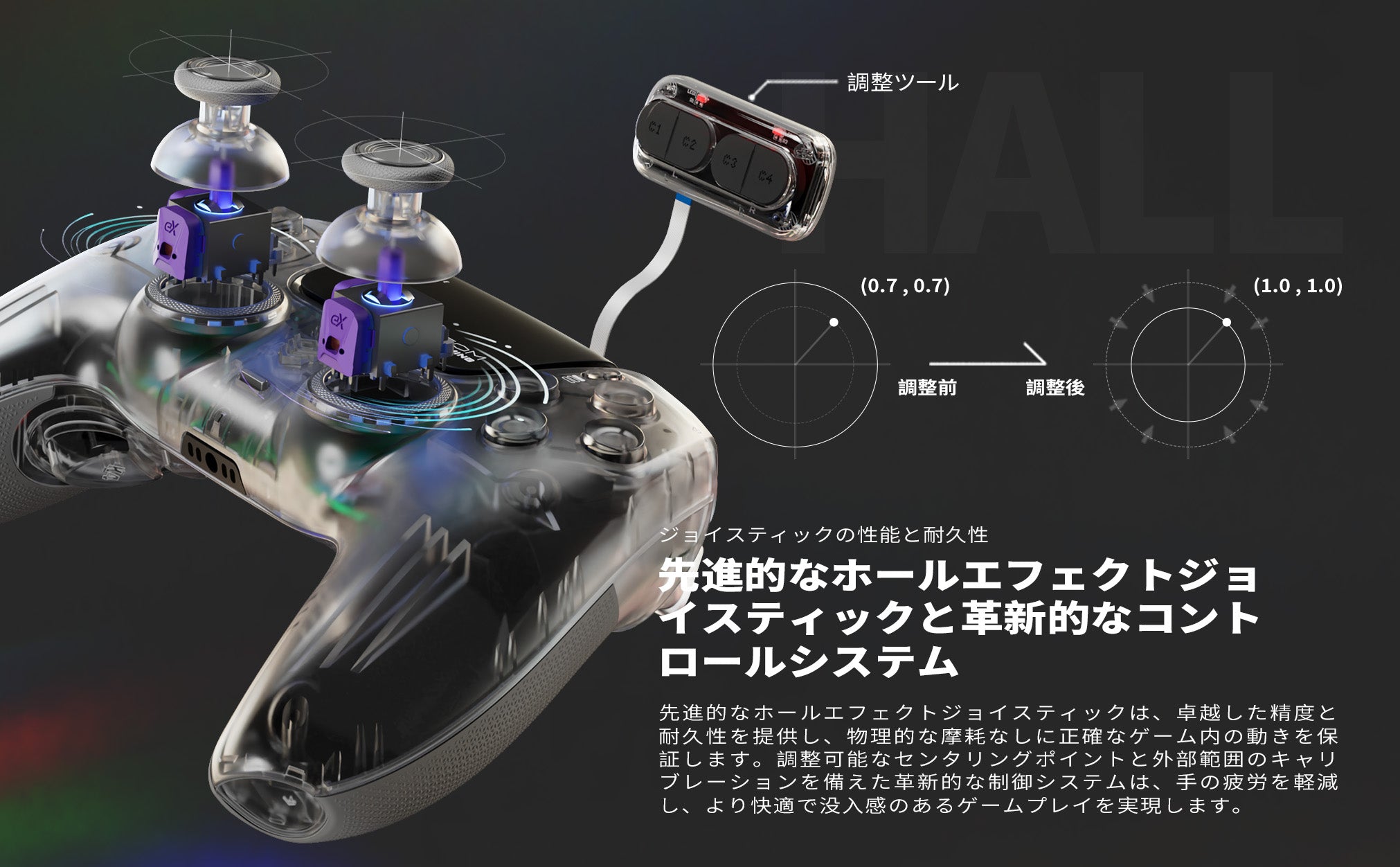 - 2種類のジョイスティックオプション: オフセット・スティック・ドリフト - 独自のDrifixテクノロジーにより、サムスティックをピンポイントの精度に保ちます。調整可能なジョイスティックモジュールにより、軸のずれを0.12の範囲で調整でき、コントローラの性能を最大限に維持できます。卓越したジョイスティック性能と耐久性 - 高度なホール効果ジョイスティックは、卓越した精度、長持ちする耐久性、信頼性の向上を実現し、ゲーム中の正確な動作と、物理的な消耗を伴わないコントロールの向上を可能にします。革新的なコントロールシステムによる、調整可能なセンタリングポイントおよび外側範囲のキャリブレーションは、長時間のゲームセッションにおける手の疲労を軽減し、より快適で没入感のあるゲームプレイを実現します。