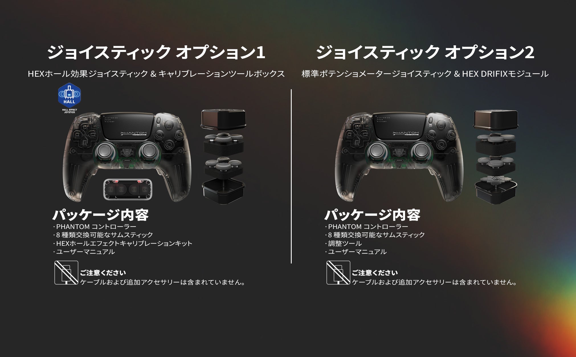 パッケージ内容 - PS5およびPC用PHANTOM eSportsコントローラー、交換可能サムスティック8本、調整ツール、ユーザーマニュアル。ワイヤレスコントローラーにはケーブルやその他のアクセサリーは付属しません。