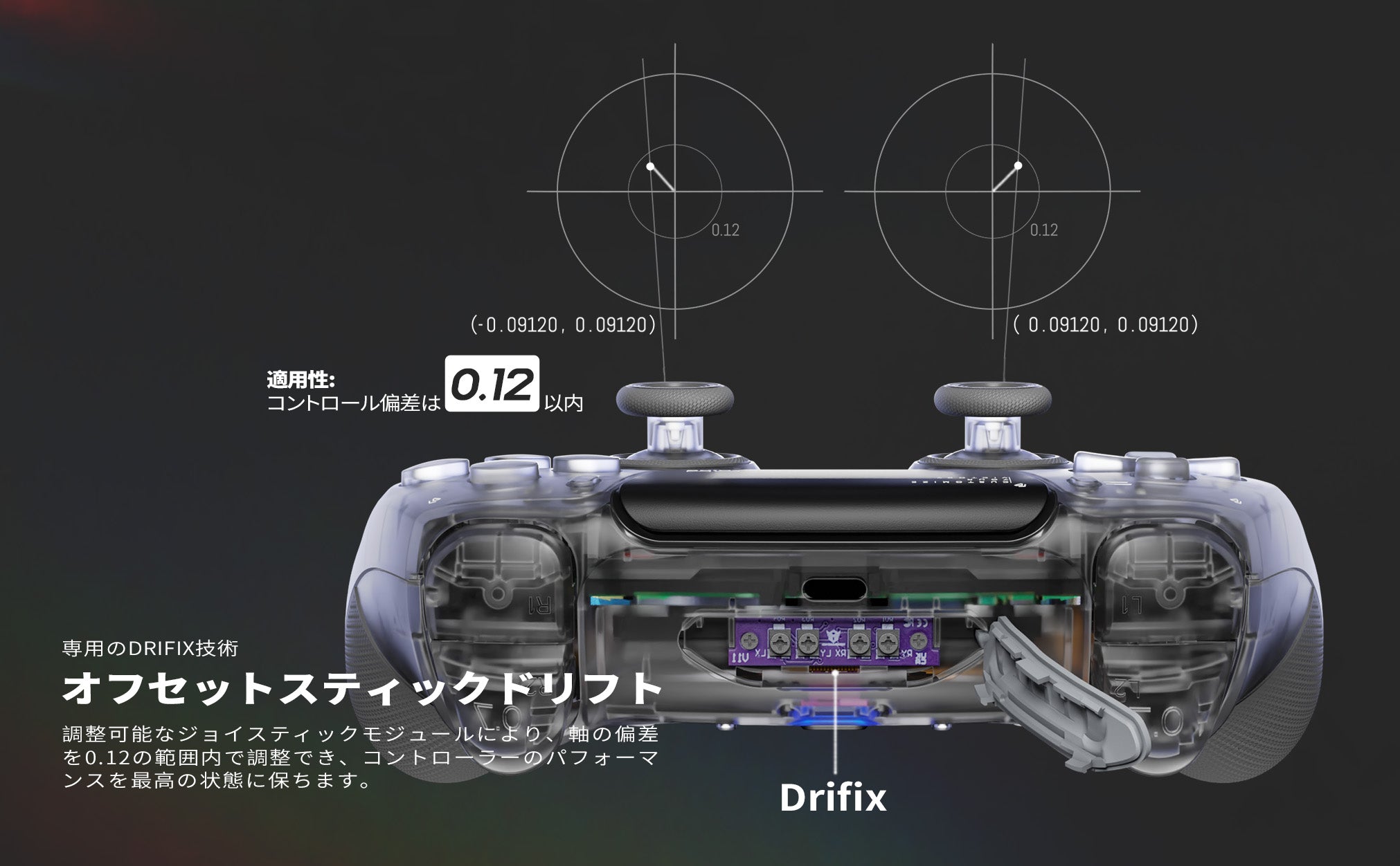 オフセットスティックのドリフト - 独自のDrifixテクノロジーにより、サムスティックをピンポイントの精度に保ちます。調整可能なジョイスティック・モジュールは、0.12の範囲で軸のずれを調整でき、コントローラーの性能を最大限に引き出します。