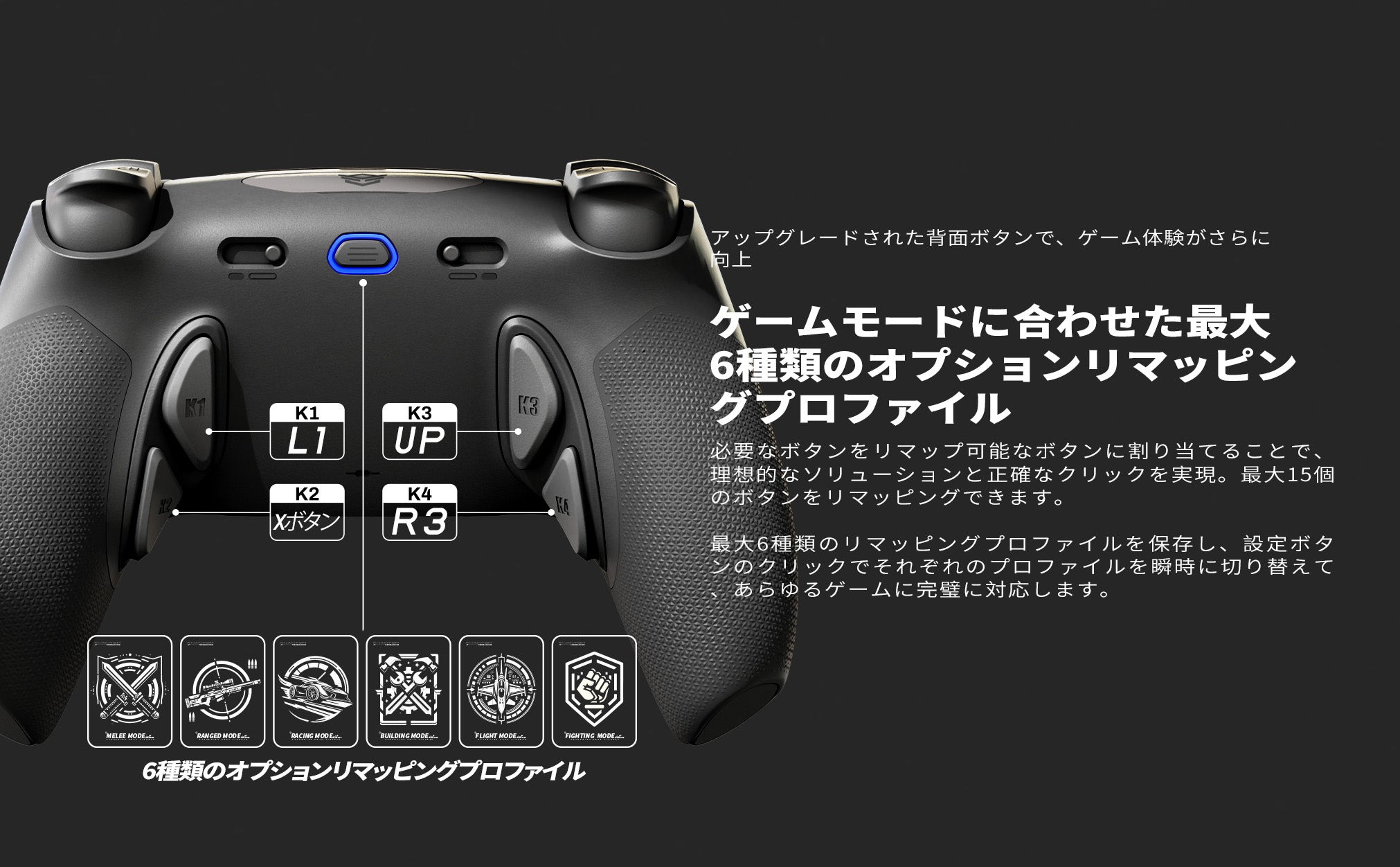 - レイアウトをカスタマイズ: 完全にリマップ可能な改造背面ボタンと6つのスワップ可能なプロファイルにより、コントロールを正確に調整し、レイアウトをシームレスに切り替えることができます。コントローラ下面の人間工学に基づいたポイントに配置された4つの触感の良い改造背面ボタンは、優れたハンズオンフィーリングと正確でクリック感のあるボタン押下を提供し、6つのスワップ可能なプロファイルは、あらゆるゲームやプレイスタイルに合わせてレイアウトを瞬時に切り替えることができます。