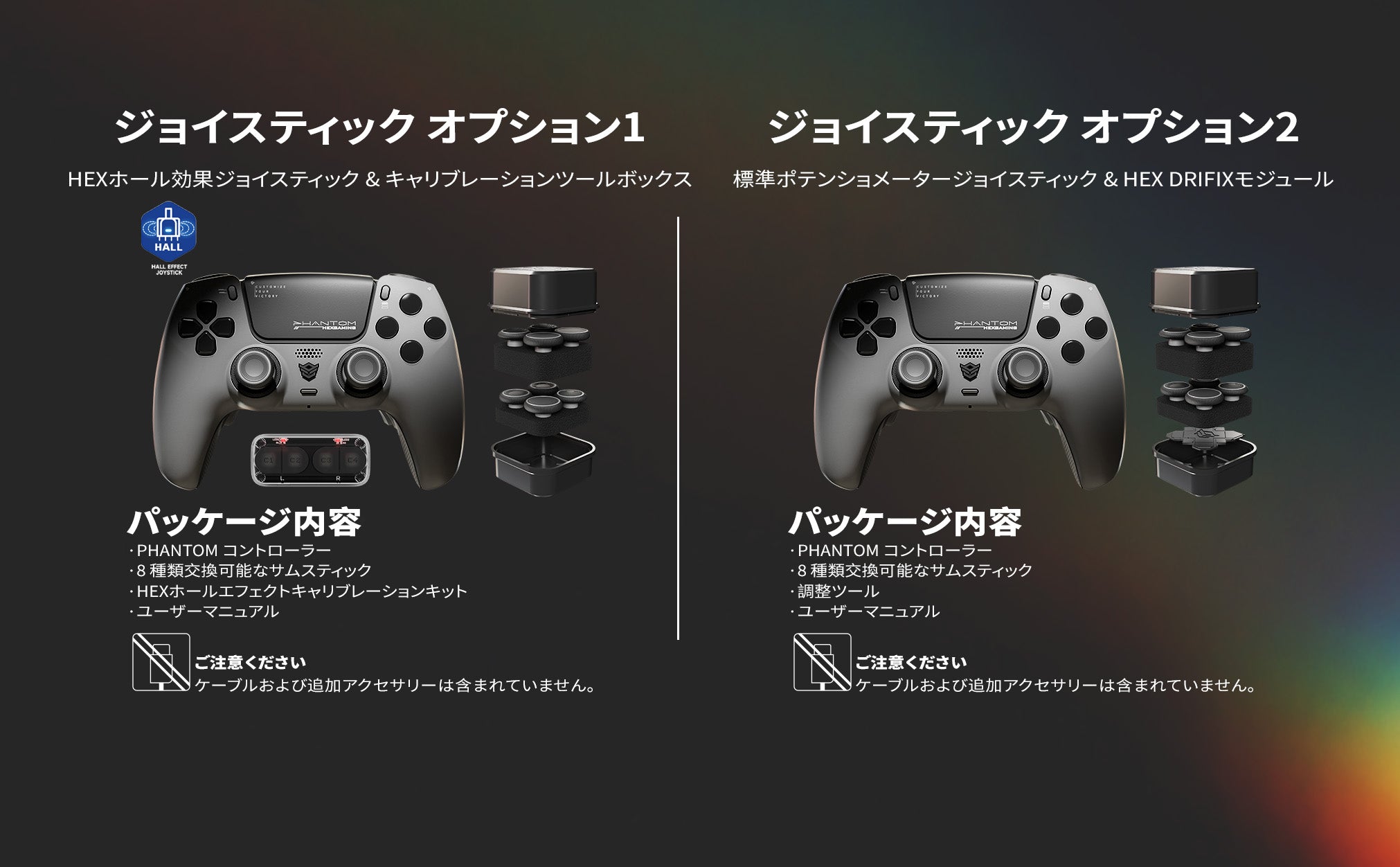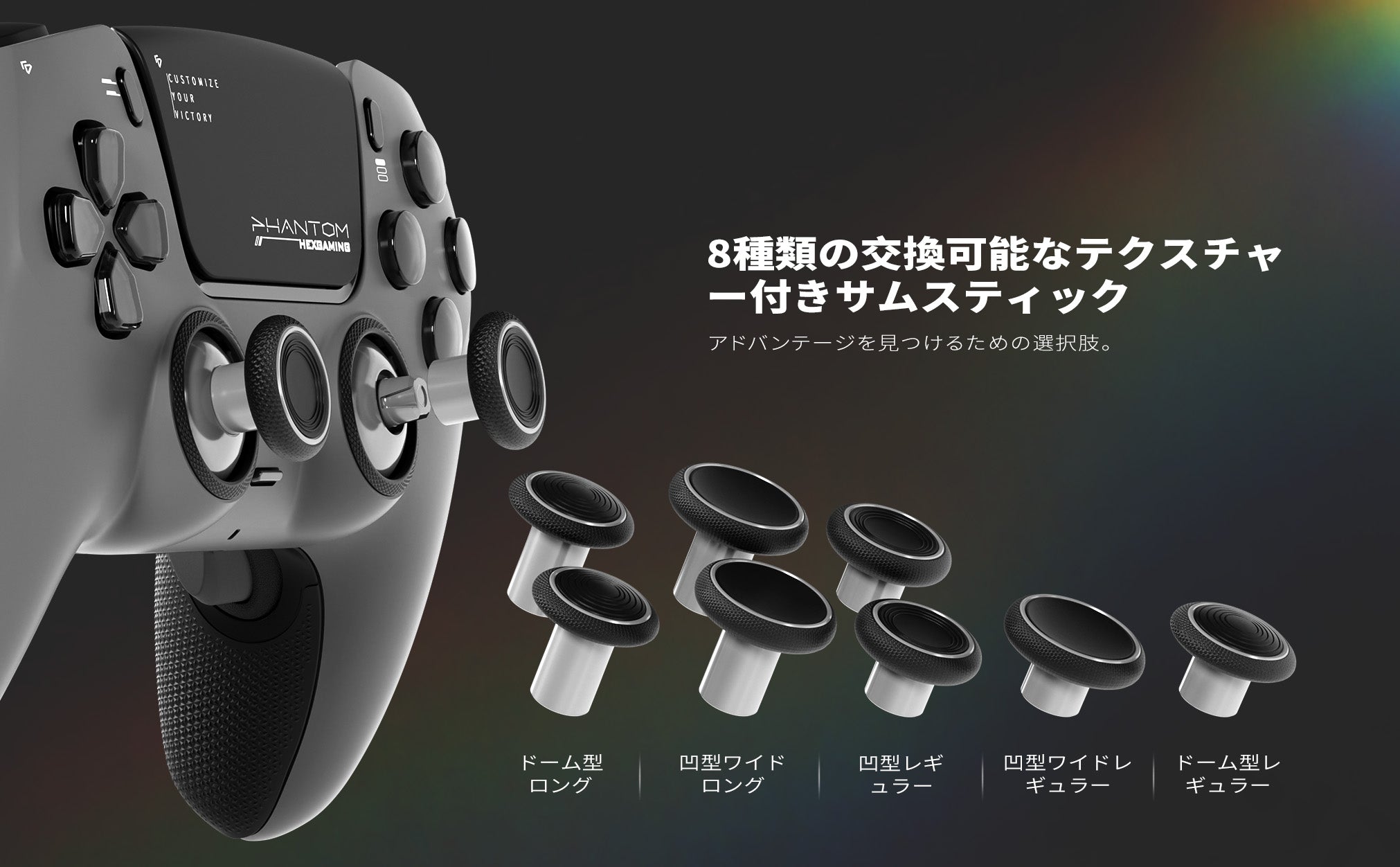 - パッケージ内容: PS5/PC用PHANTOM eSportsコントローラー、交換可能サムスティック8本、調整ツール、ユーザーマニュアル。