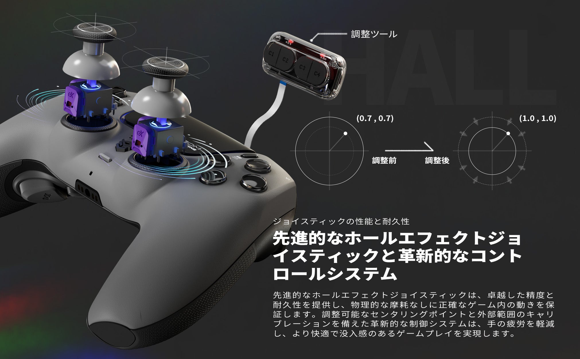 - 2種類のジョイスティックオプション: オフセット・スティック・ドリフト - 独自のDrifixテクノロジーにより、サムスティックをピンポイントの精度に保ちます。調整可能なジョイスティックモジュールにより、軸のずれを0.12の範囲で調整でき、コントローラの性能を最大限に維持できます。卓越したジョイスティック性能と耐久性 - 高度なホール効果ジョイスティックは、卓越した精度、長持ちする耐久性、信頼性の向上を実現し、ゲーム中の正確な動作と、物理的な消耗を伴わないコントロールの向上を可能にします。革新的なコントロールシステムによる、調整可能なセンタリングポイントおよび外側範囲のキャリブレーションは、長時間のゲームセッションにおける手の疲労を軽減し、より快適で没入感のあるゲームプレイを実現します。