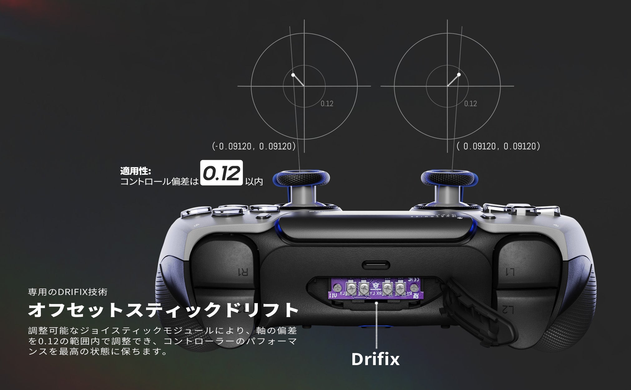 オフセットスティックのドリフト - 独自のDrifixテクノロジーにより、サムスティックをピンポイントの精度に保ちます。調整可能なジョイスティック・モジュールは、0.12の範囲で軸のずれを調整でき、コントローラーの性能を最大限に引き出します。