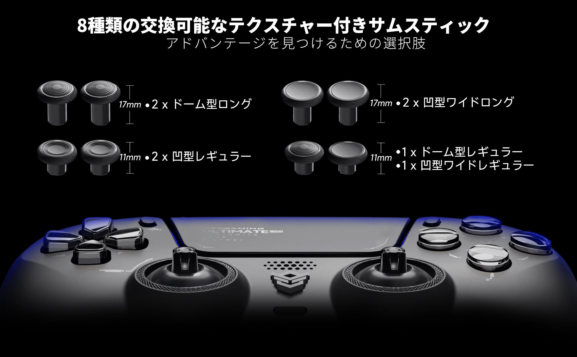 交換可能なサムスティック – 高さや形状が異なる8種類のサムスティックから選択でき、グリップ力と操作精度を向上させます。