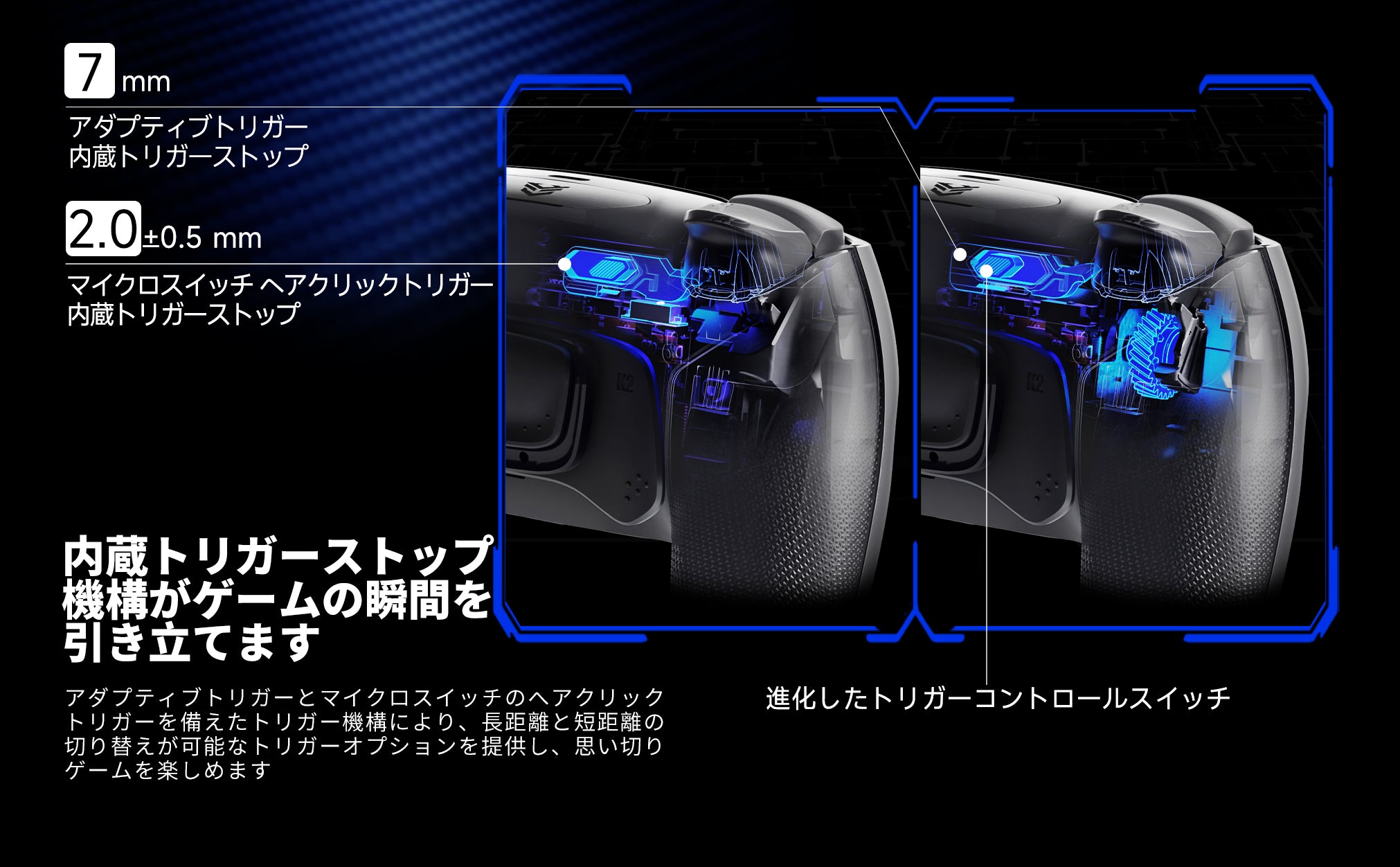 トリガーストップ機構を内蔵し、ゲーミングモーメントを際立たせます。