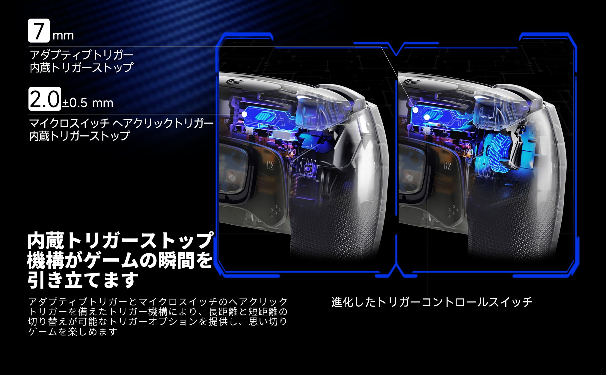 トリガーストップ機構を内蔵し、ゲーミングモーメントを際立たせます。