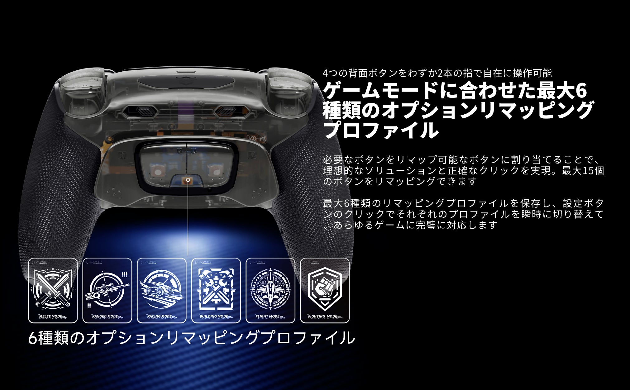 リアコントロール – 2本の指で4つのリアボタンを簡単に操作可能。突起状の滑り止め加工により、誤操作を防止します。最大6つの切り替え可能なプロファイルに対応し、さまざまなゲームやプレイスタイルに柔軟に対応できます。