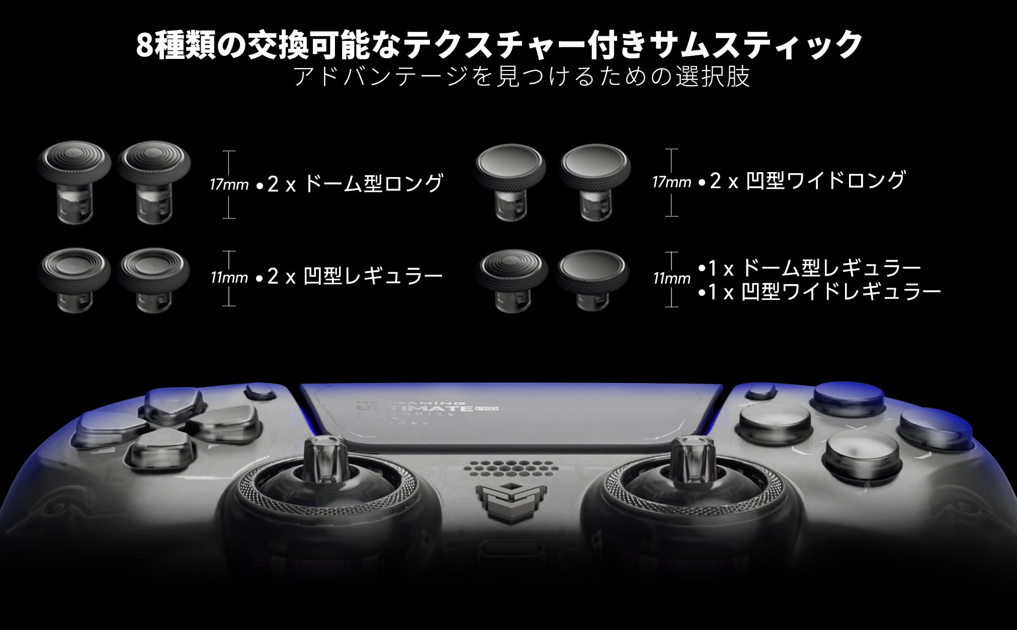 交換可能なサムスティック – 高さや形状が異なる8種類のサムスティックから選択でき、グリップ力と操作精度を向上させます。