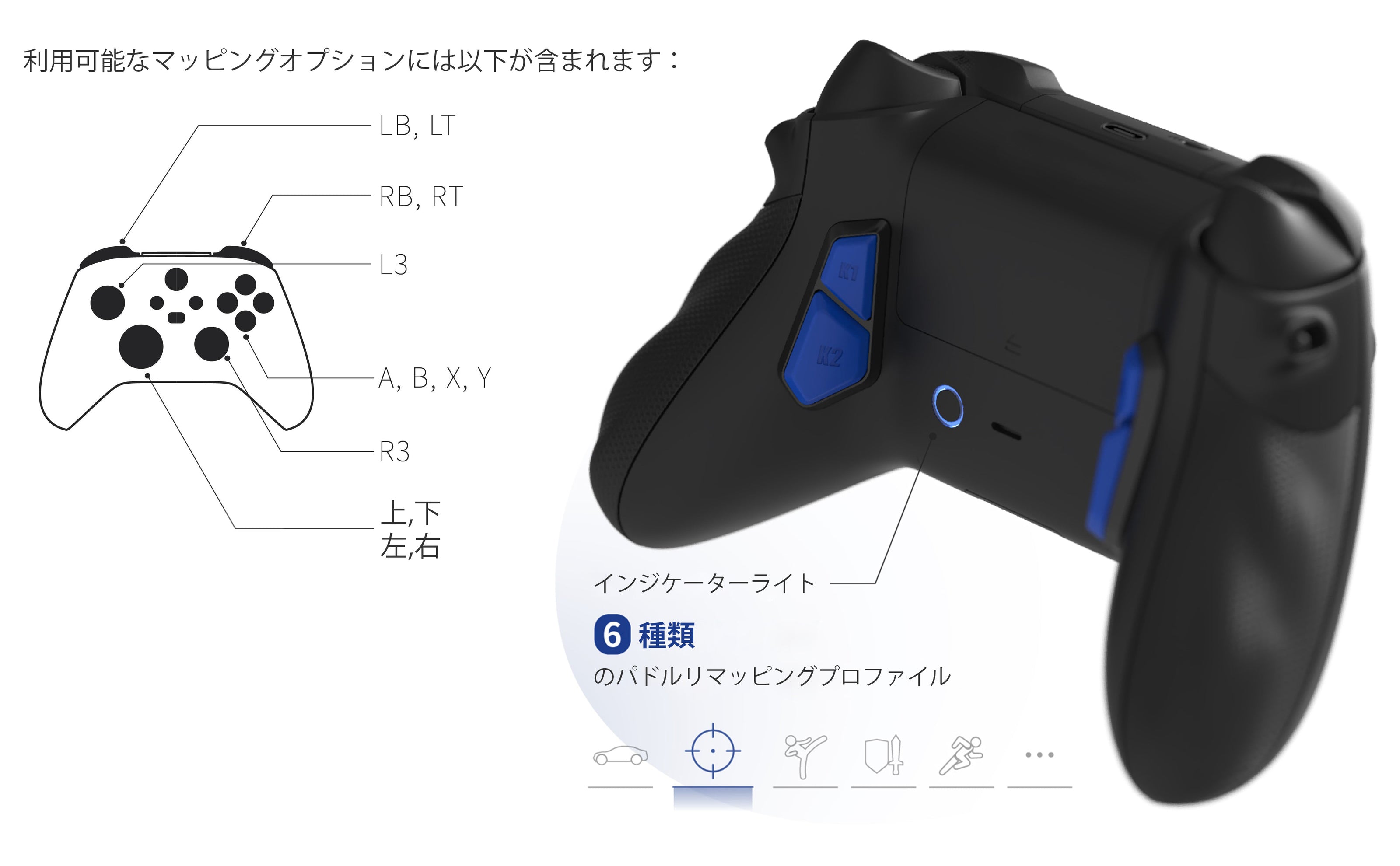 - 異なるゲームは異なるプレイスタイルを要求します。最大6つの異なるパドルリマッププロファイルを保存し、ボタンを押すだけで即座に切り替えることが可能です。最大14個のボタン(A、B、X、Y、R3、L3、上、下、左、右、LB、RB、LT、RT)を背面ボタンに割り当てることができます。