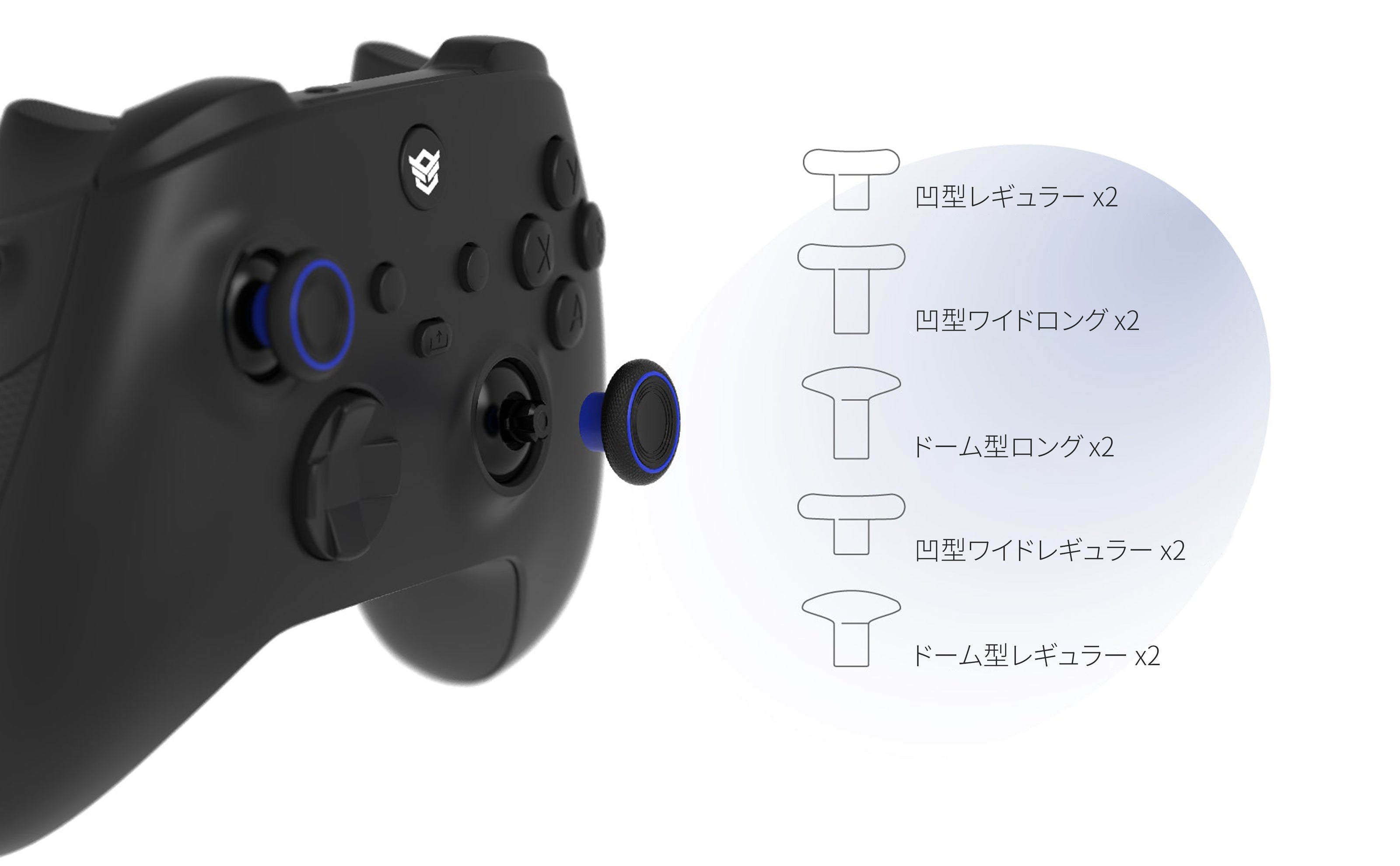 プレイスタイルに合わせて手の大きさを変えられる、8本1組のサムスティックで動きをコントロールしたり、精度を高めたりできます。
